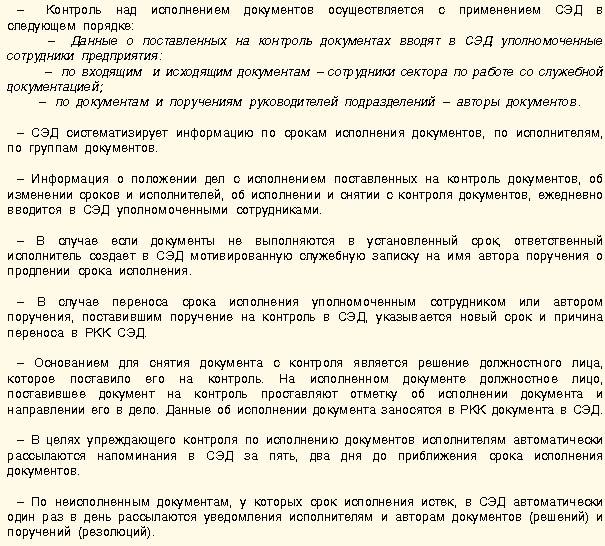 Если в организации используется СЭД, то не только процесс отправки на согласование, но и контроль исполнения поручений также может идти в электронном виде. Порядок контроля исполнения документов и поручений, а также разграничение полномочий контроля между сотрудниками описываются в разделе «Выдача поручений и контроль исполнения документов».