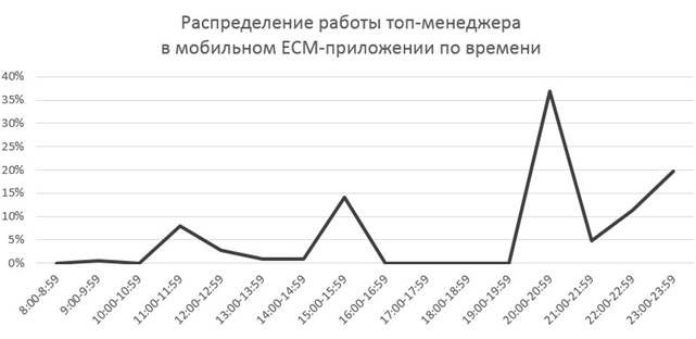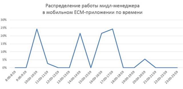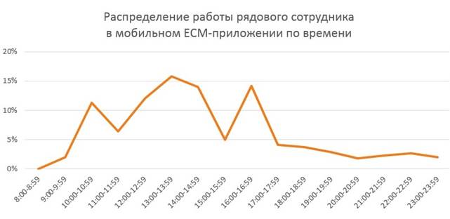 В основном рядовые сотрудники осуществляют действия при помощи мобильных приложений в течение рабочего дня с 9:00 до 18:00 с высокой интенсивностью в обеденное и послеобеденное время. Тем не менее, по завершении трудового дня вплоть до 00:00 совершается 15% всех действий в приложении.