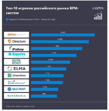 На фоне растущего спроса на оптимизацию бизнес-операций российские ИТ-поставщики демонстрируют и уверенный рост выручки. По итогам 2024 года топ-10 компаний рынка заработали на BPM-проектах 15,6 млрд рублей. Лидером рейтинга стала BPMSoft с выручкой 2,5 млрд рублей (+20% к 2023 году). Второе место занял Directum: доход от поставок BPMS составил 2,2 млрд рублей, рост — почти 70%. Замыкает тройку «Айфэлл» — около 2 млрд рублей и прирост 27% год к году.