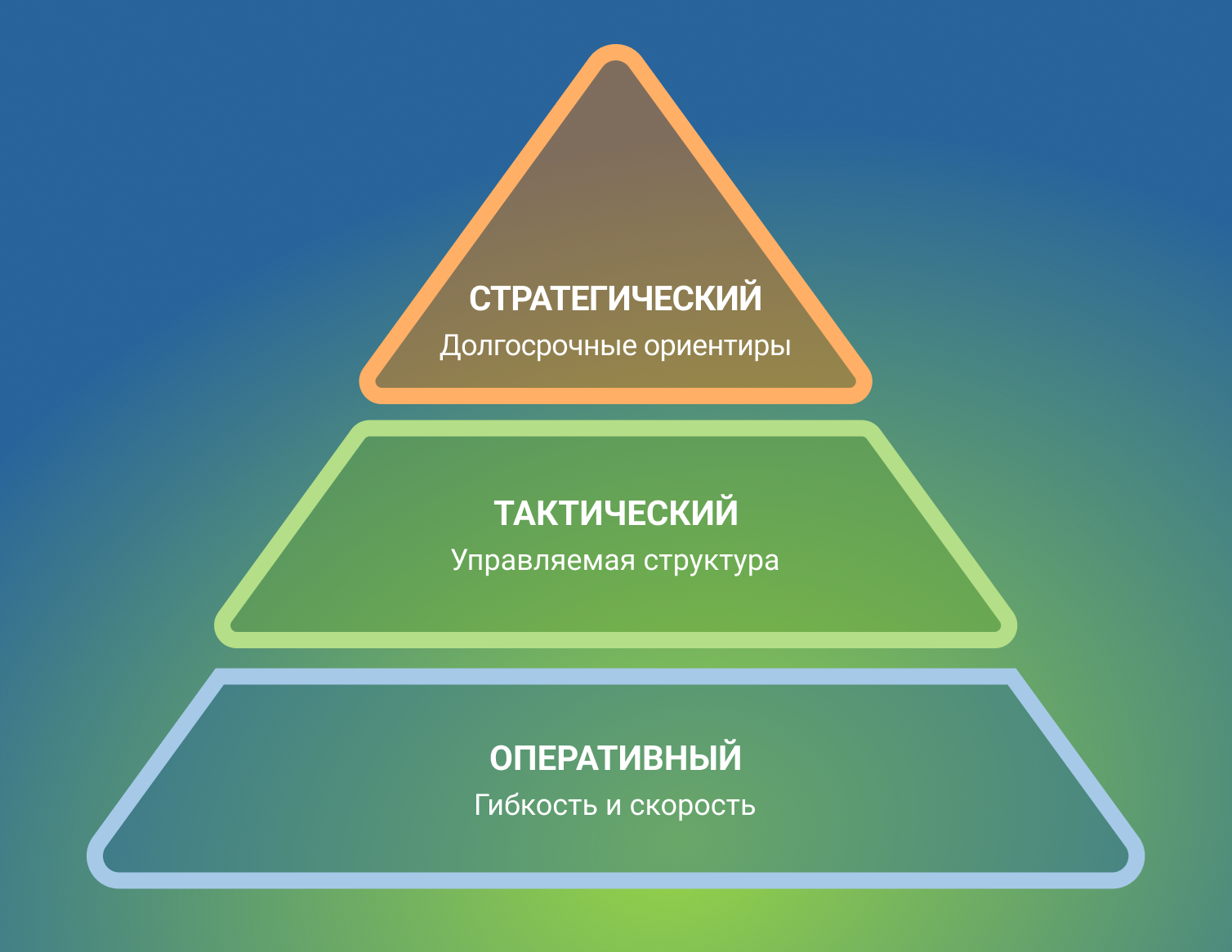 - Стратегический — фокус на долгосрочных целях, портфелях и бюджетах. Здесь нет места гибкости. Бизнесу важны жесткие контрольные точки, статус здоровья проектов, прогнозируемая дорожная карта. На этом уровне, как правило, работают акционеры и топ-менеджмент.