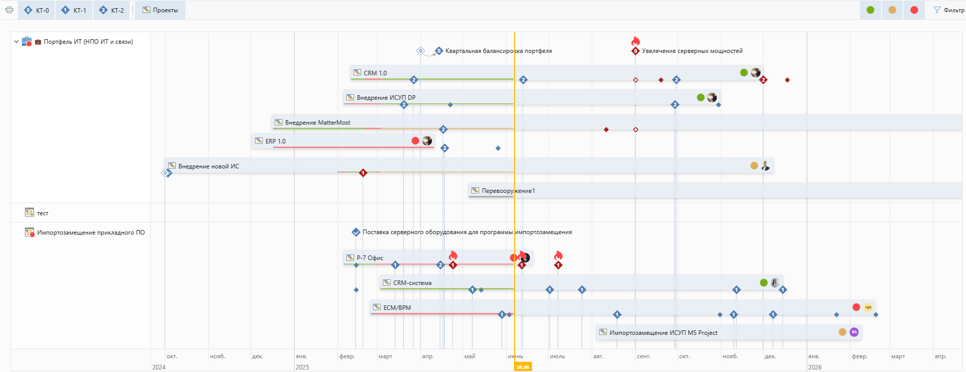 - Топ-менеджмент и проектный офис работают на стратегическом уровне — формируют дорожную карту, где видны все контрольные точки по портфелю проектов. Любое отклонение фиксируется в реальном времени, и руководство может оперативно принимать управленческие решения. Дополняет картину классификатор проектов с преднастроенными шаблонами календарных графиков и KPI. Благодаря этому система автоматически сравнивает текущие планы с базовыми и отображает «светофор здоровья» проектов. Таким образом, на верхнем уровне пирамиды управления всегда видны актуальные статусы всех проектов компании и стратегическая карта развития.
