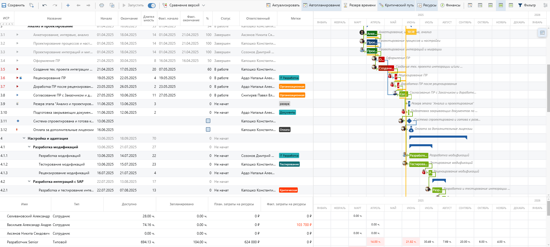 - Тактический — зона ответственности руководителей проектов. Здесь разрабатываются календарные графики, распределяются ресурсы, строится критический путь. Тактический уровень служит мостом: он переводит стратегические ориентиры в конкретные планы и транслирует наверх руководству реальную динамику исполнения.