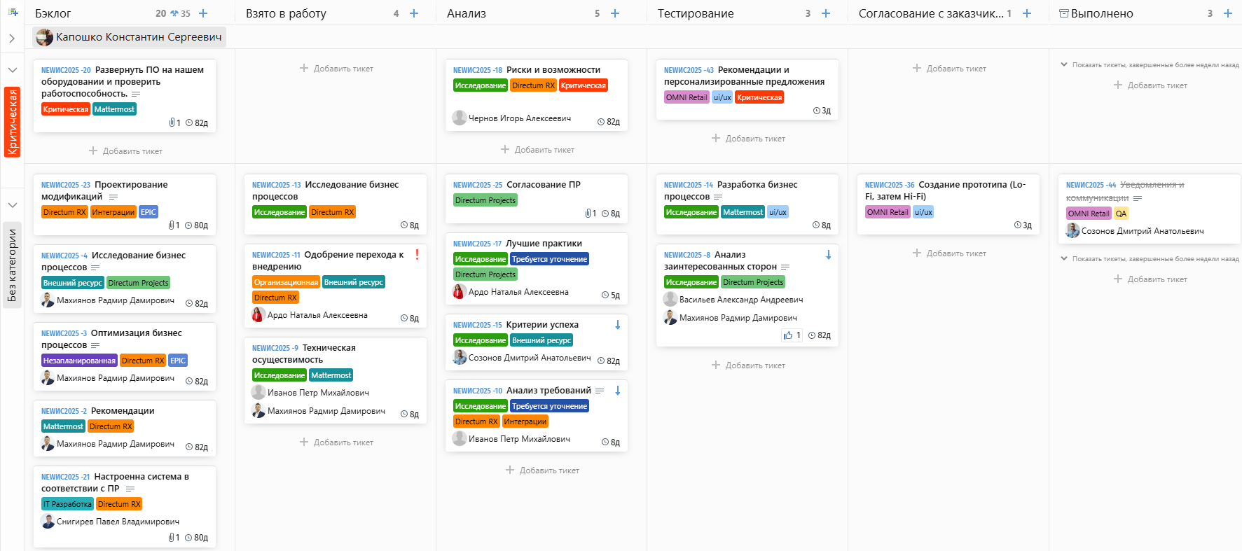 - На оперативном уровне находятся исполнители: Agile-среда дает возможность создавать доски с выбранным фреймворком, настраивать WIP-лимиты, свимлайны и теги. Ключевое преимущество Directum Projects — это связь досок с планом проекта. Проектные задачи этапов превращаются в тикеты, проходят через все стадии реализации или попадают в бэклог. Задание при необходимости можно разбить на дочерние тикеты. Все изменения отображаются на плане: если есть задержка, то руководитель может пересмотреть сроки проекта с помощью автопланирования на диаграмме Ганта. Корректировки плана в свою очередь влияют на стратегические контрольные точки.
