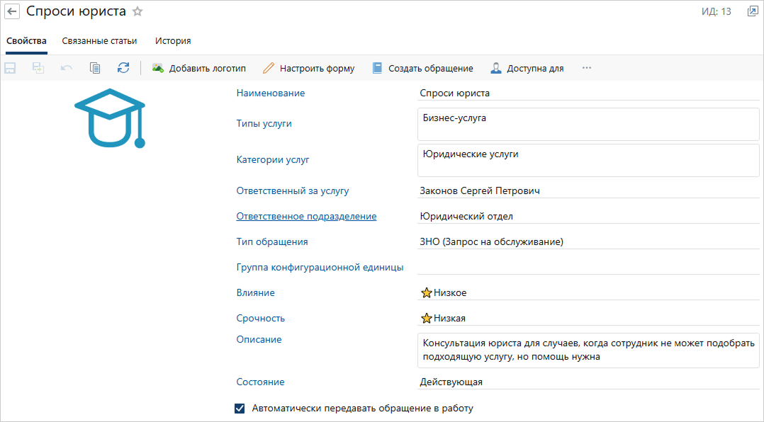 Установите флажок, чтобы обращение по текущей услуге сразу передавалось в работу сотруднику (или роли), указанному в поле «Ответственный за услугу»