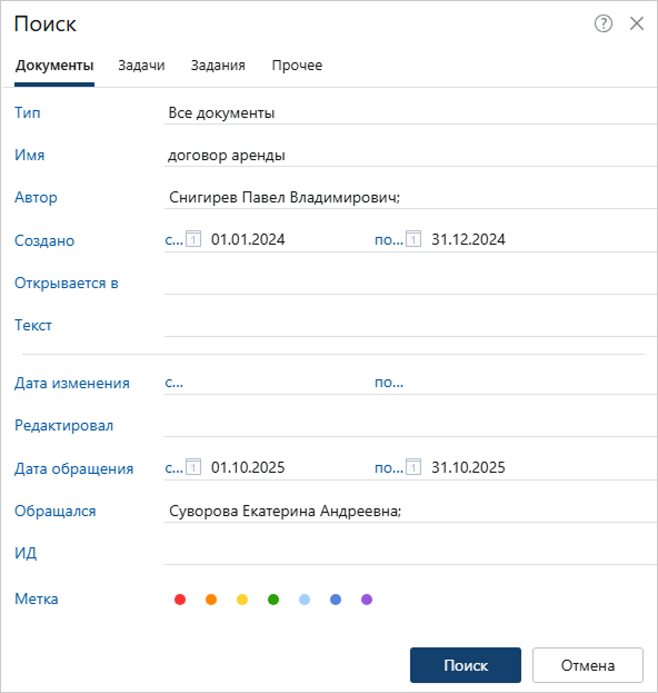 Поиск по автору, периоду создания документа, сотруднику, который обращался к документу, и периоду обращения