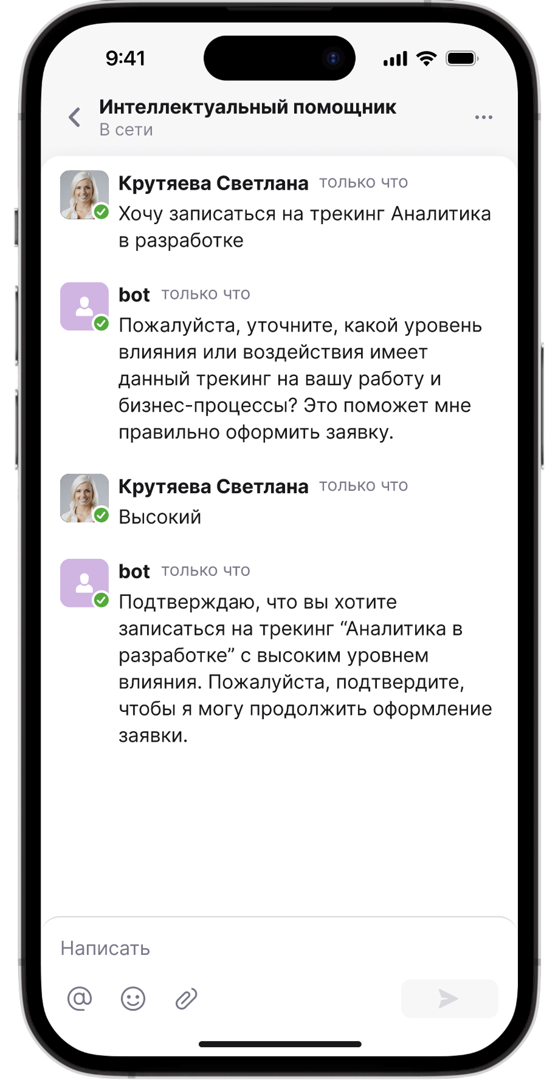 Например, если сотруднику нужно записаться на обучающий курс, то он обращается в чат со встроенным ИИ. Интеллектуальный помощник отправляет заявку и выдает ее идентификационный номер, чтобы отслеживать статус. Работник тратит на все действия не больше минуты.