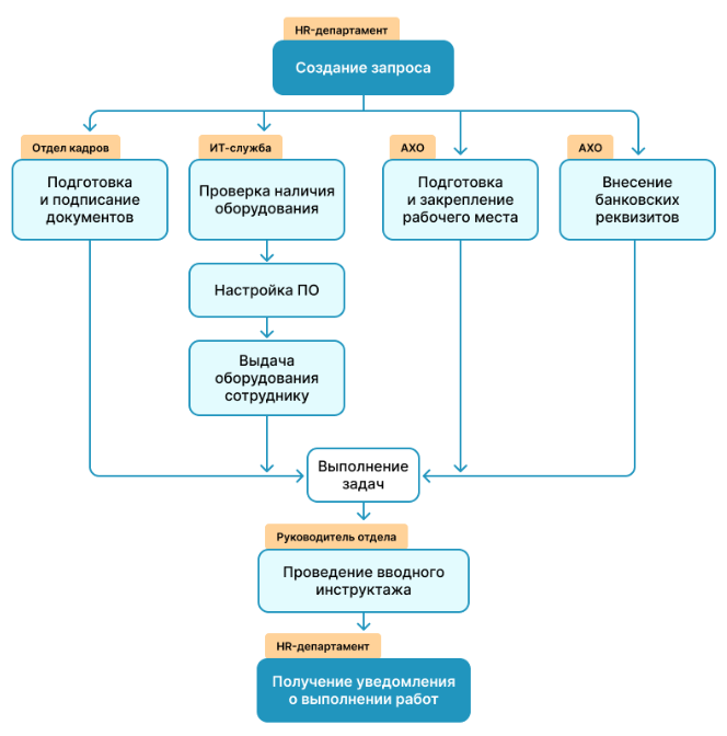 Эйчар инициирует задачу на старт онбординга — и уведомления приходят всем нужным подразделениям по цепочке. Только после подготовки рабочего места, настройки ПО, подписания документов, назначения наставника и первичной адаптации процесс завершается.