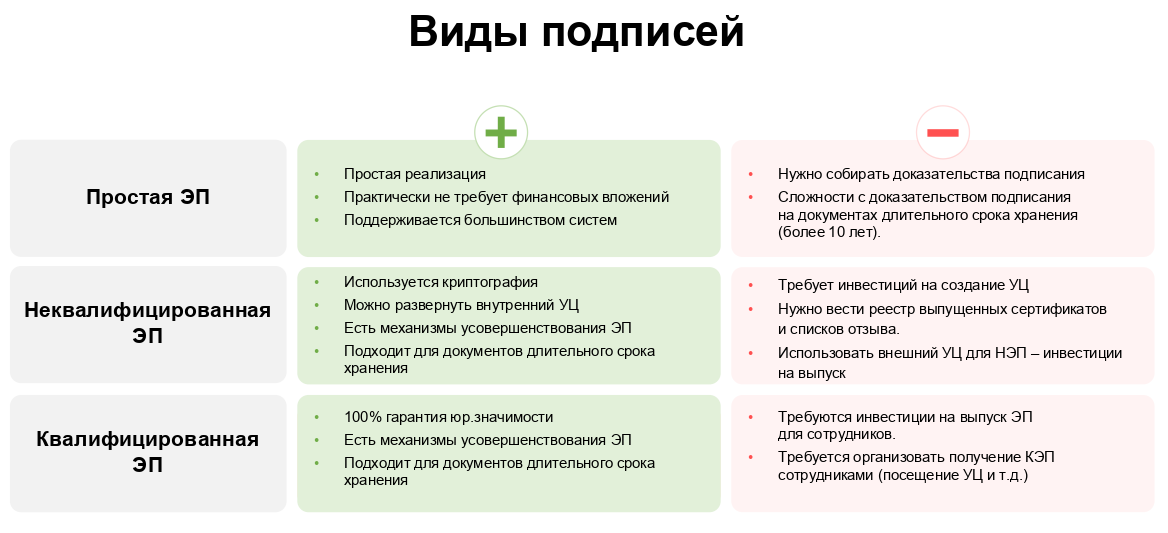 - Усиленная неквалифицированная электронная подпись (НЭП) имеет бОльшую правовую силу. Может быть использована внутри организации, если подписаны соглашения с сотрудниками, а вход в учетную систему защищен процедурой аутентификации.