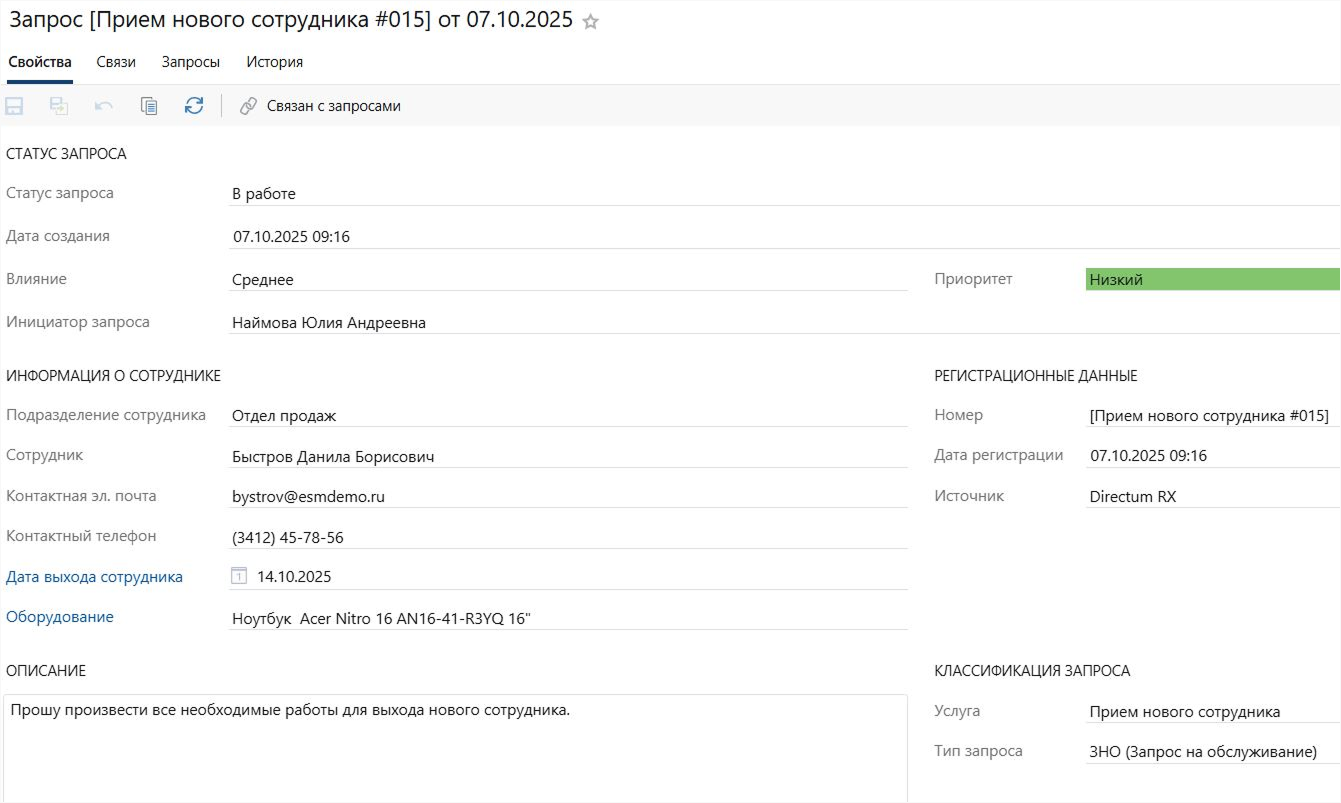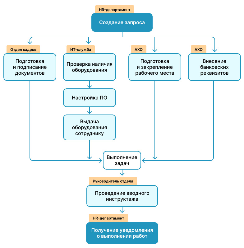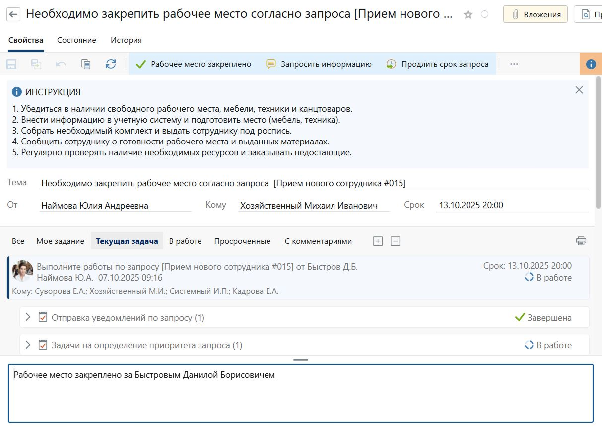 Задача приходит в АХО. Административной службе необходимо подготовить рабочее место и закрепить его за новичком. В обращении можно дополнительно запросить оформление пропуска или внесение реквизитов зарплатной карты в систему.