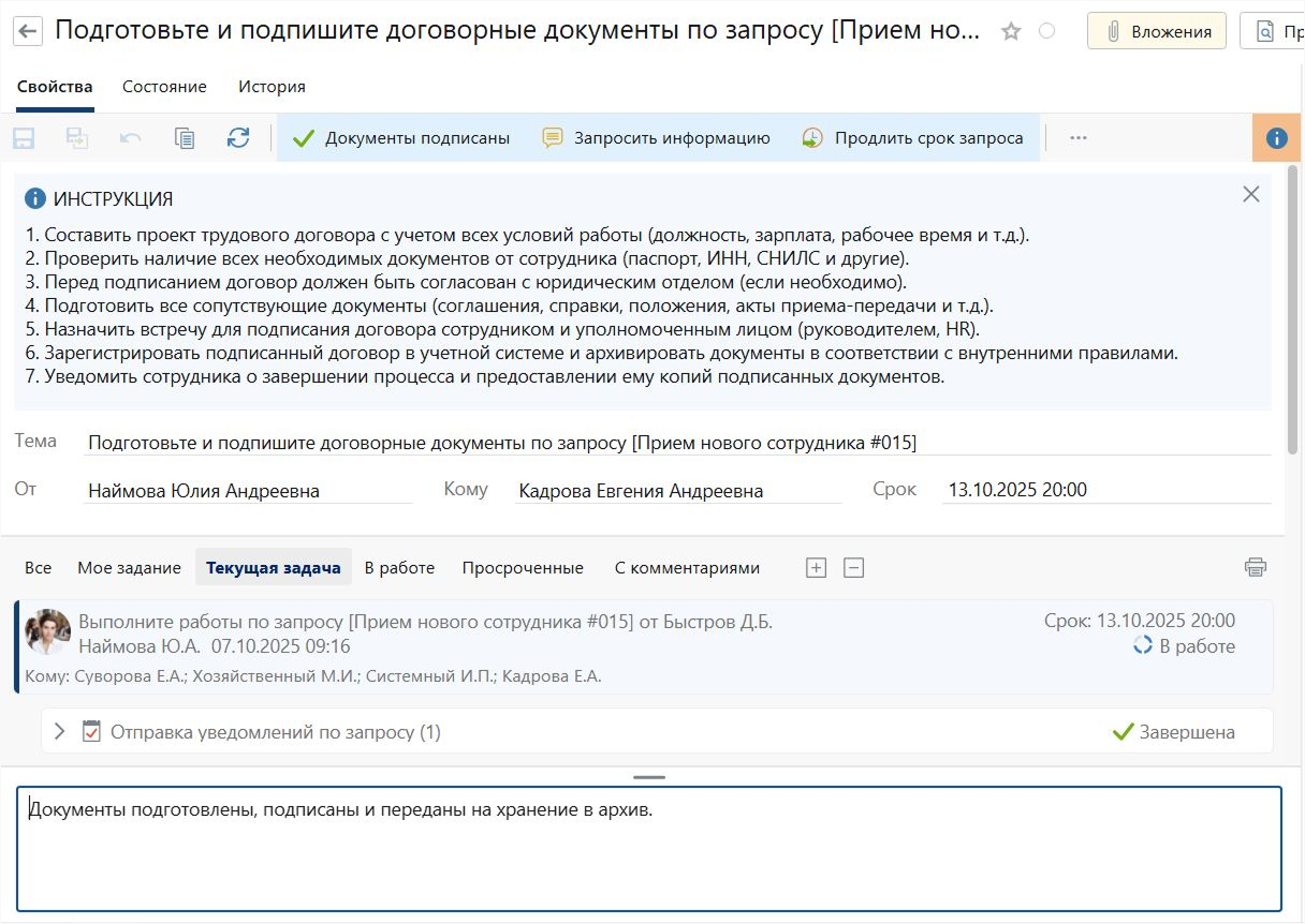 Допустим, кандидат принял оффер. Значит, нужно подписать трудовой договор. Первым задачу в ESM-системе получает отдел кадров — на подготовку и подписание пакета документов. У ответственного сотрудника есть инструкция, право на продление срока или запрос дополнительной информации. Можно выбрать, в каком виде подписывать документы — на бумаге или в цифре. При электронном заключении договора новичок может даже не приезжать в офис — всё проходит в удаленном формате. Это возможно благодаря бесшовной интеграции с системой Directum HR Pro, в которой доступно цифровое подписание с авторизацией через Госуслуги.