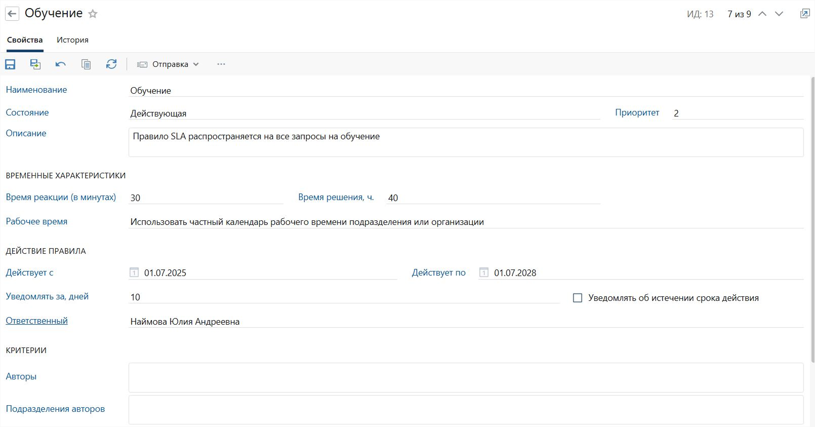 Правила SLA — скорость реакции и выполнения задачи — настраиваются очень гибко. Без углубления в код ответственные сотрудники (например аналитики) записывают время решения запроса, привязывают рабочие календари, назначают исполнителей, выставляют приоритет.