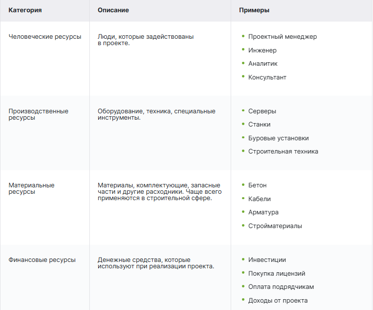 Это любой ограниченный актив (материальный или нематериальный), который необходим для выполнения задач и достижения целей проекта. Ресурсы делятся на несколько типов: