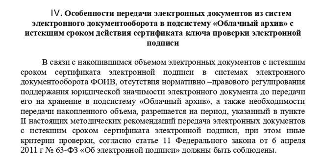 Хотя можно согласиться с тем, что с обеспечением длительной сохранности документов, подписанных УЭП, есть проблемы, — но утверждать о том, что законодательством вопрос вообще не урегулирован, как-то чересчур. Никто, например, не запрещает руководителю источника комплектования подписать (бумажный или электронный) акт о том, что все 100 миллионов документов, передаваемых на каком-нибудь съёмном жёстком диске, являются подлинными; никто не препятствует воспользоваться услугами электронного нотариуса … Известна также практика сохранения вспомогательных документов — самих сертификатов и списков отозванных сертификатов — на основе которых можно доказать действительность УЭП. Есть и другие подходы…